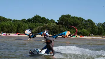 En el sitio excepcional dellago de Biscarrosse, los principiantes, los aficionados y los confirmados encontrarán qué practicar esta actividad náutica en las mejores condiciones (viento y sol en particular). Entre las muchas ventajas del sitio, cabe destacar que los kitesurfistas tienen pie hasta 300 m de la orilla, ideal para seguir y supervisar a los aprendices.