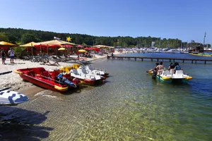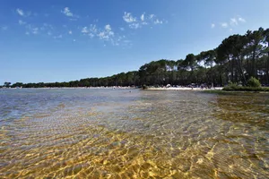 El lago de Biscarrosse, de aguas cristalinas de color turquesa, es único en la costa atlántica. Bordeando las playas, sus aguas poco profundas se asemejan a una laguna del Pacífico, lo que lo convierte en un lugar idílico, especialmente seguro para niños y adultos, sobre todo porque la temperatura del agua en verano oscila entre 24 y 28°C".