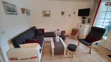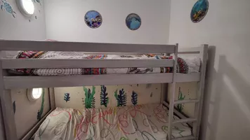 Salón de 21 m2, cocina americana totalmente equipada, 1 habitación doble, 1 habitación con literas, 1 cuarto de baño con bañera, 1 cuarto de ducha con ducha y WC.