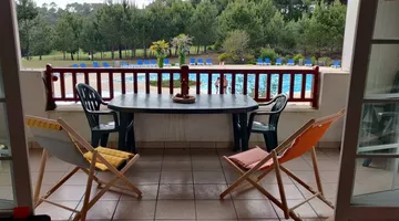 Apartamento para 4 personas (+ 2 camas mediante sofá cama en el salón), terraza de 13 m2 (mesa, sillones, tumbonas) frente a la piscina y el campo de golf.
