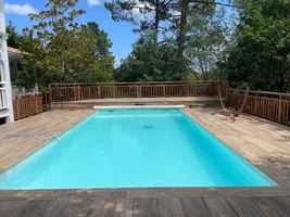 Au cœur du domaine du Golf de Biscarrosse, nous vous proposons à la location une villa de famille de 165 m² sur un terrain de 1250 m². La villa a été intégralement rénovée et meublée en 2023. Dotée de 4 chambres, de 3 salles d’eau, de 2 WC et d’une grande pièce principale de 60 m², la villa peut accueillir 8 personnes. La piscine (9mx4,5m) sécurisée est entourée d’une terrasse de 100 m². De la piscine vous accédez à une quatrième salle d’eau dotée d’un WC. Une grande terrasse couverte permet également de prendre les repas à l’abris du soleil.