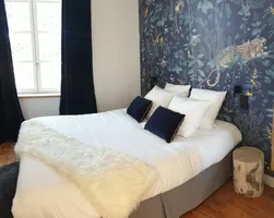 Aquí, la piedra, la madera y las vigas vistas se codean... con una decoración refinada; se mire donde se mire, cada elemento, cada detalle ha sido cuidadosamente elegido; nuestro deseo era destacar la artesanía, lo hecho a mano, el "Hombre que hace", el movimiento de la vida...De este modo, en el antiguo edificio del presbiterio, "el hombre que piensa", hemos querido preservar la historia del lugar con una decoración estrafalaria y en las habitaciones un vínculo con el arca de Noé... el lugar del ser humano, de los animales en nuestra relación con la tierra, nuestra relación con la naturaleza.