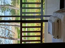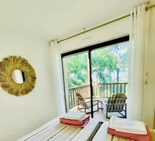 Los dúplex son de una sola planta y disponen de dos habitaciones en el primer piso: una habitación principal y una habitación doble con balcón, una terraza cubierta con vistas a un frondoso jardín para disfrutar de las tardes haga el tiempo que haga, una cocina americana totalmente equipada (placa eléctrica, frigorífico superior, microondas, mini-horno, cafetera de filtro, hervidor de agua y tostadora) y una sala de estar con TV.