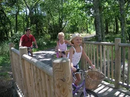 El carril bici que une Mimizan o Biscarrosse discurre junto a la zona de camping car, y el acceso al pueblo se realiza a través de un florido paseo.