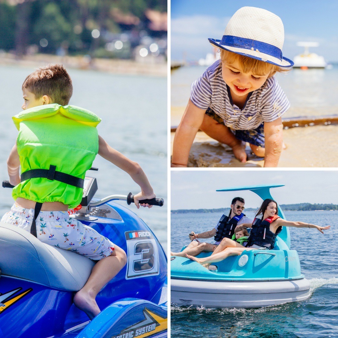 Quant à Evan, il se transforme en matelot le temps d’une session pédalo ! Terre en vue ! On rentre au port pour échanger le pédalo pour un Oxoon (bateau électrique) mais Evan lui, préfère les sensations fortes et opte pour le jet-ski pour enfants ! Pendant qu’Evan s’amuse en jet-ski, Gianni est bercé par les vagues et s’endort sur l’Oxoon… Retrouvez aussi notre top des activités pour enfants à Bisca Grands Lacs !