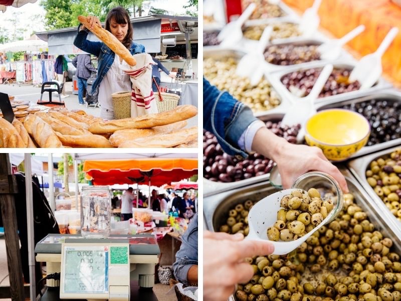 Tomates, courgettes, cerises… On fait le plein de produits frais et de saison sans gaspiller un seul sachet ! Prochaine étape, le pain : la baguette et les viennoiseries dans le sac à cet effet et le tour est joué ! Nous continuons à échanger avec Marjorie en se dirigeant vers le stand d’épices, où elle sort un gros bocal pour faire le plein de bonnes olives ! On en a l’eau à la bouche… Les olives, c’est toujours synonyme des longues soirées d’été et des apéritifs ! 🫒