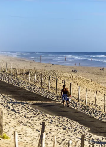 Facile d'accès et proche du centre de Biscarrosse-Plage, c'est l'un de nos coins préférés pour une session baignade (ou une session surf 🏄♀️). Dès votre arrivée en haut de la plage, vous avez une vue à 180° sur l'étendue de sable face aux vagues. Vous pouvez descendre via le tapis sur la droite, ou par le sable sur la gauche : faites chauffer les mollets !