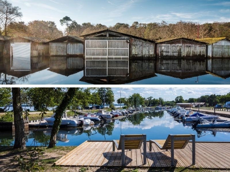 Au village lacustre de Gastes, on adore se balader dans ce petit port et admirer les cabanes à bateaux, qui font tout le charme du lieu.