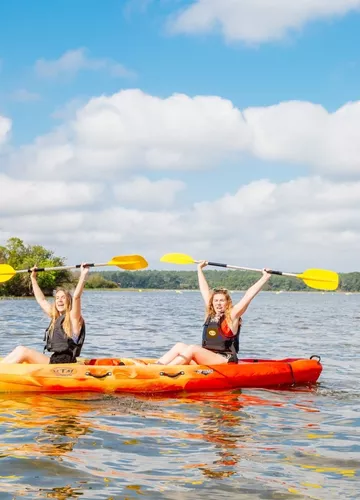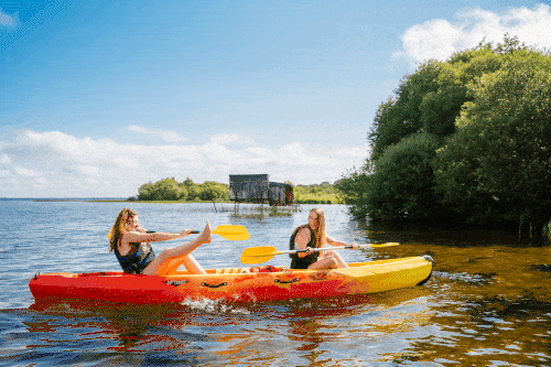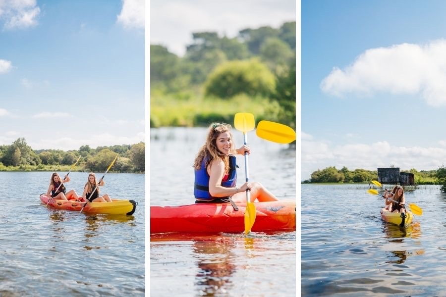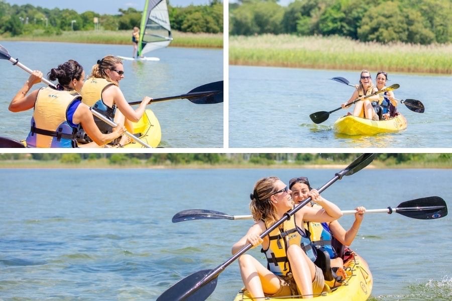 Entre musculation des bras, baignade et rigolades, votre séance canoë-kayak sur le lac de Sanguinet promet d’être mémorable !