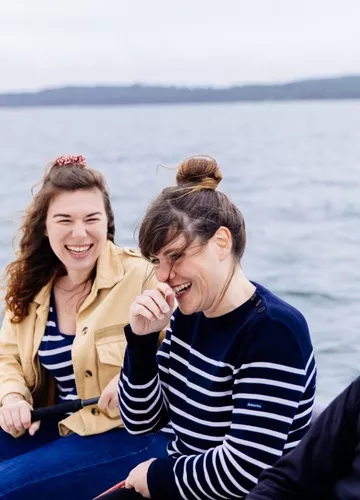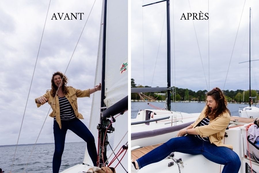 Chacune à son poste ! Morgane a pour mission de choquer la grand-voile. Pas de panique, on vous explique ! Elle doit simplement faire en sorte de toujours prendre le vent pour avancer dans la bonne direction. Et croyez-nous, ce n’est pas une mince affaire… Quant à moi, je tiens la barre (appelée le safran) ! Mon objectif ? Regarder droit devant et fixer un point (bouée, arbre ou maison sur les rives) pour ne pas perdre le cap.