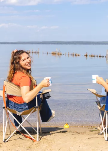 On commence par un arrêt à Port Maguide, le lieu le plus animé sur le Lac Nord. Le choix en activités est très vaste. On a choisi de se faire tracter sur une bouée (spoiler alert : aucune de nous n’a réussi à tenir bien longtemps dessus…). On vous conseille de rester 2 nuitées sur les rives nord du Lac Cazaux-Sanguinet-Biscarrosse. Si vous recherchez plus de calme, on vous invite à poursuivre votre route le long du lac jusqu’à Port Navarrosse à seulement 5 minutes. On n’est pas bien là, les doigts de pieds en éventail ?