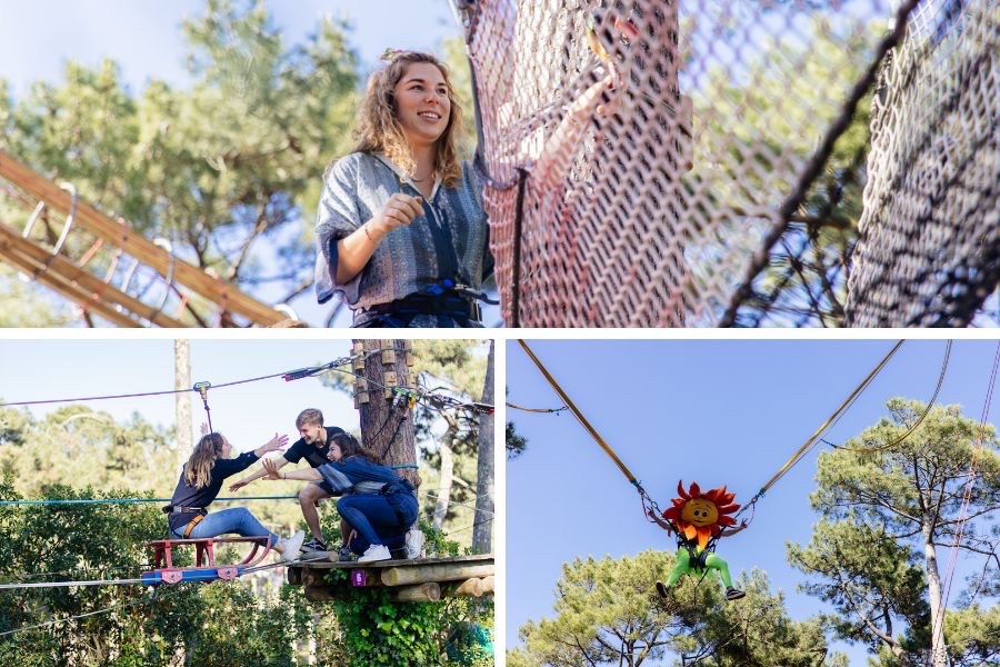 Robin des Bois n’a qu’à bien se tenir ! Toute votre tribu débarque entre les pins pour une 3ème journée de vacances placée sous le signe de l’aventure. Fini le farniente sur la plage et les balades toute douces : place aux tyroliennes, aux ponts de 🐒 et à la catapulte ! Enfilez vos baudriers, Bisc’Aventure et Parentis Aventure sont vos terrains de jeux pour la journée 😉