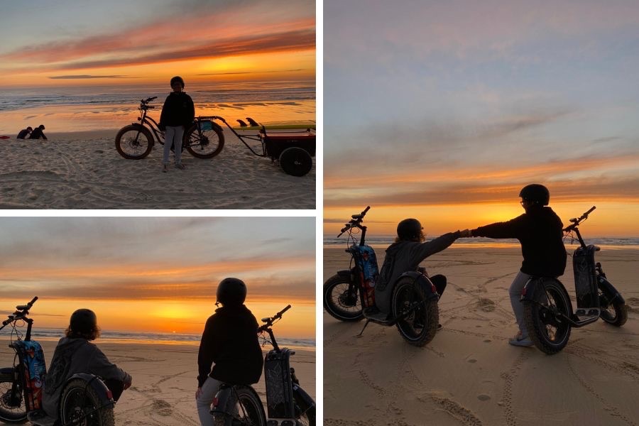 C’est la golden hour ! 🤩 Prenez un guidon, une plage déserte et une guide passionnée : vous obtenez un sunset 2.0 sur le sable encore chaud. Vous reconnaissez ? Oui, c’est ici que vous avez étalé votre serviette pour la journée. Il reste encore les ruines du château de la forteresse de sable ingénieusement bâtie par le petit dernier. C’est désormais au guidon d’une 🛴 ou d’un 🚲 électrique que vous profitez de la plage, tandis que le ☀️ tire sa révérence. Une jolie parenthèse qui ravira les plus sportifs comme les éternels rêveurs. Tous en selle, suivez Christelle !