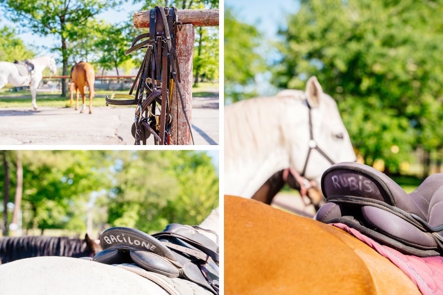 Une fois nos chevaux tout beaux tout propres, Vinciane selle Bacilone et Rubis, ainsi qu’Alson, son fier destrier. D’abord le tapis, puis la sangle, le bridon… Autant vous dire que pour cette étape, on n’a pas tout suivi. 😅