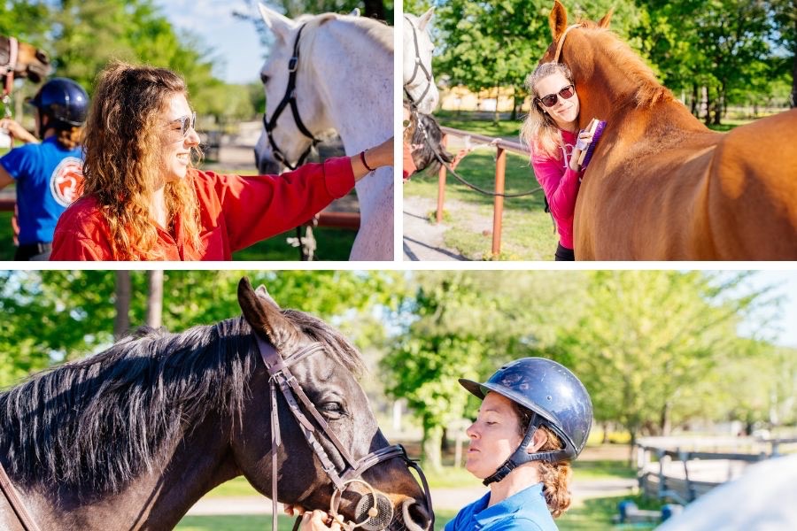Partir en balade à cheval, ça ne s'improvise pas ! On commence par une bonne séance de pansage. Et comme on veut des chevaux sympas pendant notre petite randonnée, on les brosse dans le sens du poil…