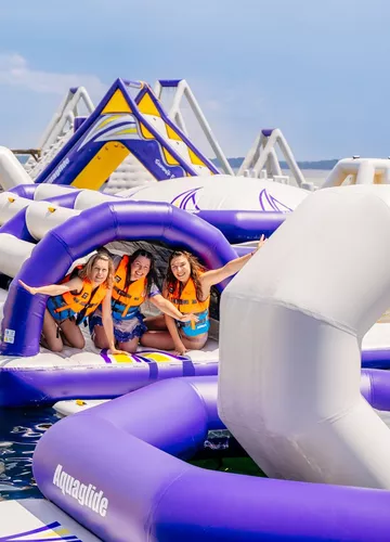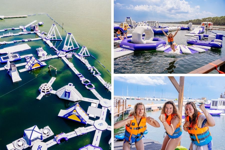 On attaque avec non pas le plus grand parc aquatique gonflable des Landes, ni de France, mais du monde ! Vous l’avez ? Il est juste là, sur le lac de Biscarrosse ! À l’Aquapark, on active l’ambiance plongeons et fous rires. Catapulte géante, waterjump, obstacles et toboggans à gogo… Entre deux gamelles dans le lac de Biscarrosse, je m’esclaffe face aux acrobaties de Camille ! Ici, enfants comme adultes sont égaux (et souvent à l’eau !) 🤓