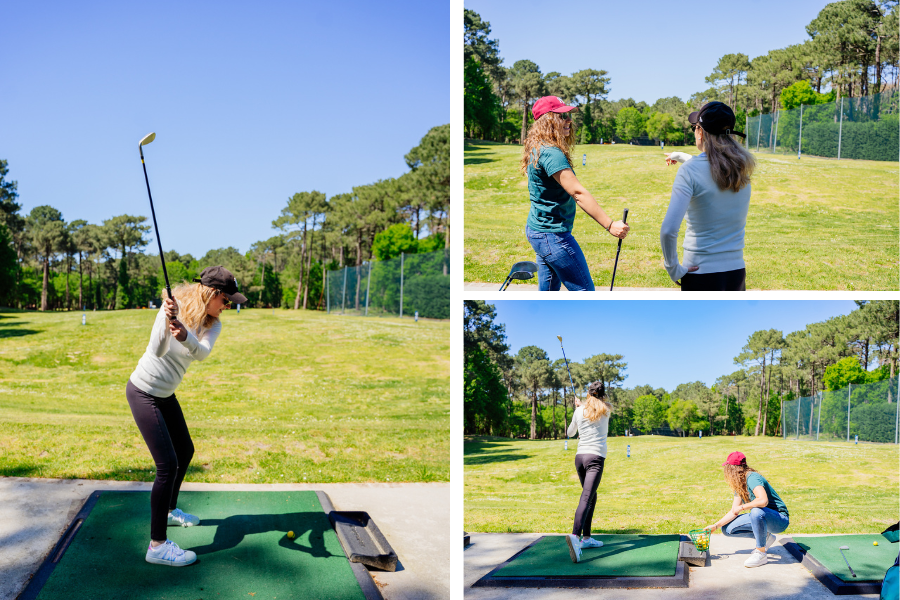 Comme on n’est pas des expertes du green, on commence par cette journée au Golf de Biscarrosse par une matinée sur le “Practice”. C’est une grande zone sans trous pour entraîner son swing, parfaite pour les débutants comme nous ! Après avoir récupéré notre seau de balles au distributeur (oui, ça fonctionne exactement comme une machine à café ?, compter 7 € pour deux sceaux), on est parties pour s’entraîner au swing et apprendre à manier notre club. Même si quelques habitués des golfs de France nous donnent des conseils, autant vous dire que ça n’a rien d’évident ! 😂