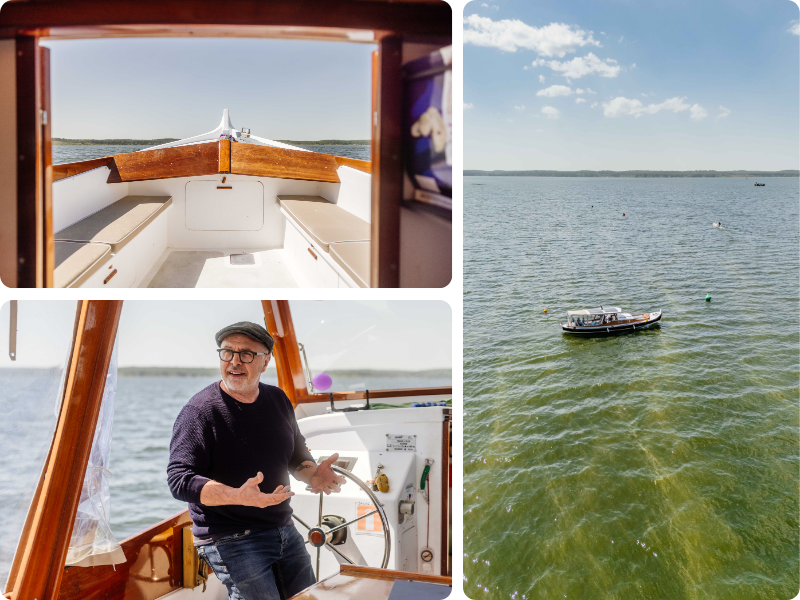 On a rendez-vous à Gastes, au port des Calicobas. Daniel nous aide à grimper à bord de sa magnifique pinasse électrique. On s’installe confortablement sur les coussins disposés sur les bancs, autour de la table en bois. On n'est pas bien là ? 😍