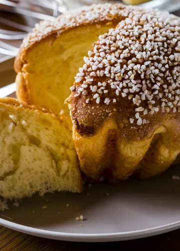 Sa texture est moelleuse, avec une mie jaune pâle, très dense. L’extérieur, de couleur jaune doré, est craquant sur le dessus et parsemé de gros morceaux de sucre concassé. Il peut être cannelé ou droit.
