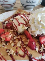 Venta in situ o para llevar de galettes y crêpes elaboradas con harinas de molinería ecológica (trigo sarraceno y trigo) directamente de Bretaña, helados artesanales y helados de crema.